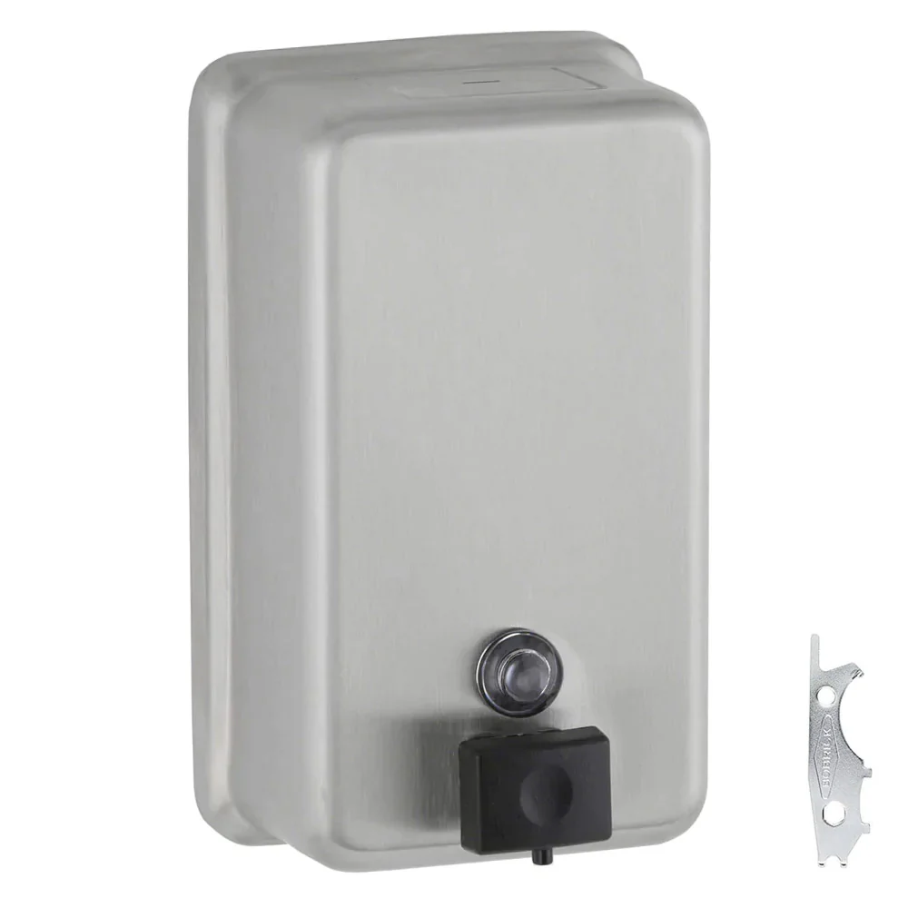 This surface mounted vertical soap dispenser from Bobrick is made from satin finish stainless steel and is perfect for use in public restrooms. It holds up to 40 fl Oz. and the valve dispenses all purpose hand soaps.